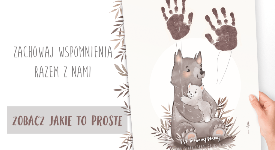 Nowością są także autorskie plakaty odciskowe – na których samodzielnie wykonasz odcisk przy pomocy stempelka, a dodatkowo umieścimy na nich imię i wiek Twojego dziecka. To nie tylko pamiątka, ale też wyjątkowa dekoracja pokoju malucha.