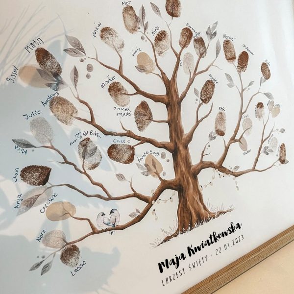 Drzewo na końcach gałązek ma miejsce na odciski palców, które powinny zostać wykonane przez gości. W taki sposób powstanie piękna i unikatowa pamiątka, którą można oprawić  w ramkę i powiesić na ścianie.